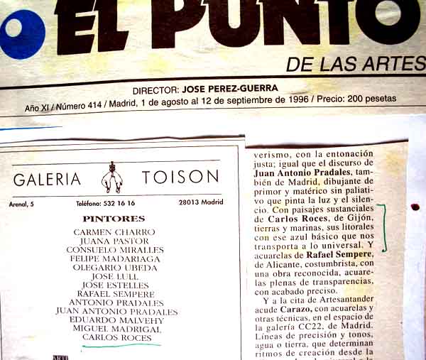 En el mes de Agosto del año 1995, Carlos Roces participa en la Feria de Arte de Santander, con la Galería Toisón de Madrid, es el único asturiano, entre pintores nacionales y extranjeros seleccionados | |||||||||