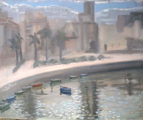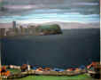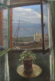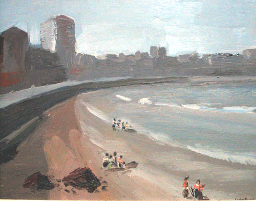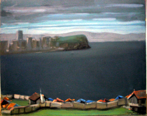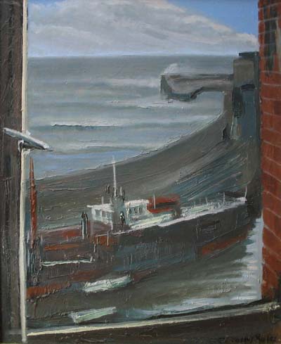 Vista desde el estudio de Carlos Roces, del Fomento de Gijón, pintada en el año 1966, con un barco en el astillero Ojeda. |