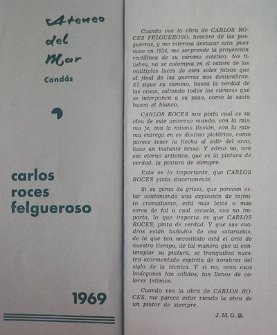 Catálogo de la exposición de Candás, con la presentación que hace Marino Galán, Licenciado en Derecho, que fue Profesor de la Escuela de Marina Civil de Gijón. |