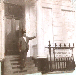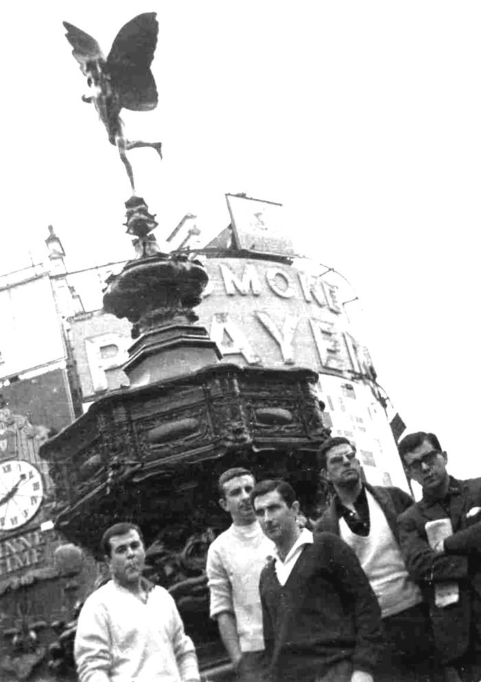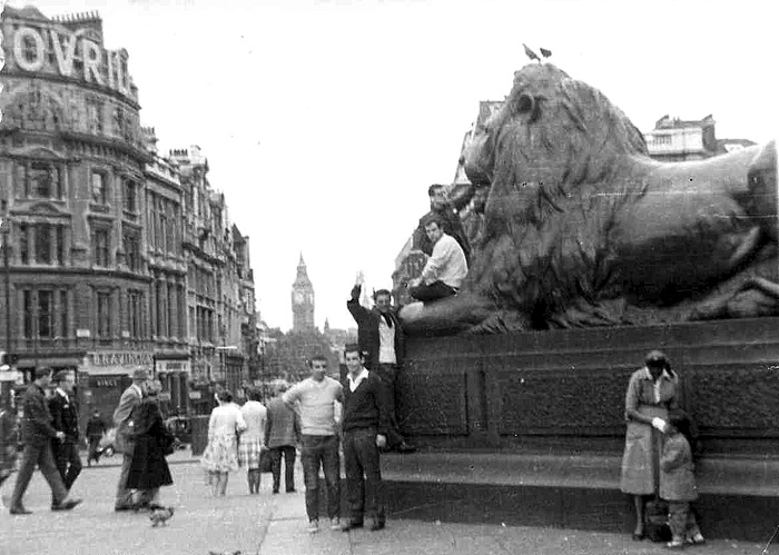 En Picadilly Circus, en Londres coindicieron muchos jóvenes gijoneses, que pretendían aprender inglés, finaciandose con algún trabajo. | Abilio Rodríguez de la Viña, Pocholo García Rendueles, Miguel Suarez Morís.. con Carlos Roces, en Trafalgar Square. |